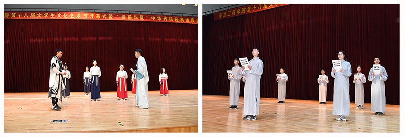 中华传统经典诵读会中,八篇凝聚古人智慧的经典片段、八种荡气回肠的澎湃激情、八段生气灵动的精彩演绎带来的是在场师生身临其境的深切感悟。学生会清灵悦耳的诵读向我们诉说了《诗经》的历史底蕴;湖光鹭影诗社带来的《周易》向我们描绘了宇宙间万事万物;特邀组织知语轩为我们讲述《声律启蒙》清新别致,超凡脱俗的美,带我们领略其卷帙浩繁;夜未央汉服社用其清脆动听的嗓音吟诵《千字文》,告诉大家心境坦然,方可无愧人生;季风配音社诵读的《大学》论述了先秦儒家道德修养理论,将儒家修身治国平天下的思想展现得淋漓尽致;图管会通过《论语》向大家展现了孔子因材施教、诲人不倦的可贵精神;天印读书会朗诵的“万经之王”《老子》采用师生问答的形式,体现了道家内容的博大精深;天印之声广播台带来的《庄子》反映了庄子的批判哲学、艺术、美学、审美观,显示了古代圣哲关于文学、美学、艺术、审美的智慧结晶。