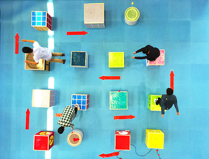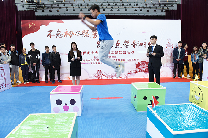 说起这个将小游戏元素融入主题实践活动的创意,主创人员徐淳钰同学特别兴奋,“年初‘跳一跳’刚流行的时候,我看过团中央的一条微信,从‘跳一跳’中延伸到对人生哲理的解读,觉得特别有趣。开学以后就开始琢磨能不能把这个流行元素和主题学习活动结合起来。”“春暖花开,正是运动和学习的好时机。我们不如把‘跳一跳’搬到体育馆来吧,配上有奖答题,游戏、运动、学习三不误。”徐淳钰的创意很快得到了分团委老师的支持。在老师的帮助下,徐淳钰、施皓、傅亚启几个同学忙乎开了,写策划、找道具、设计问题……。为了寓教于乐,引导同学们感悟十九大、思考新时代新青年的责任与担当,大家在设计问题时动足了脑筋。据介绍,活动共设计了四轮题目,分别是诗词浅赏、党团小知识、成语竞猜和“厉害了我的国”即兴演说。“玩过手机‘跳一跳’的都知道,游戏小人在一些特殊的小盒子上停一停是可以加分的,在我们现场版的小盒子上停一停、答对了问题同样也可以加分,寓意着新时代的大学生,不能两耳不闻窗外事,还要坚定信念、培养品格、开阔视野,这些都是青春的加分项。”电力凯发分团委书记的解释,说出了活动策划者的良苦用心。