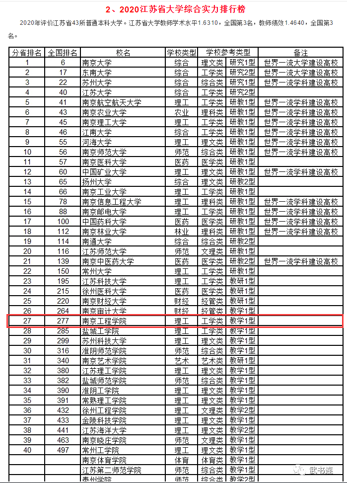 我校在武书连2020江苏省大学综合实力排名中位居27位
