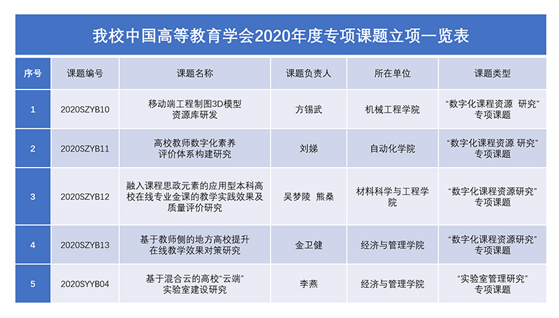 日前,中国高等教育学会发布了《中国高等教育学会关于2020年专项课题立项的通知》,共立项“专项课题”296项,我校推荐申报的课题有5项获批立项,其中包括“实验室管理研究”专项课题1项,“数字化课程资源研究”专项课题4项。我校获批“专项课题”立项数量居省内高校前列,课题立项工作再获佳绩。