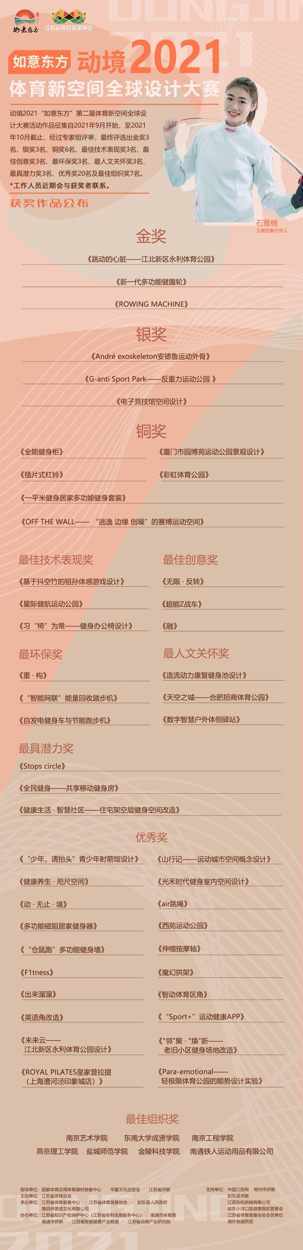 此次比赛由江苏省体育总会主办,以“动静新主张体育新空间”为主题,旨在关注生活与运动的整体融合,探索和创新设计出功能设置合理、环境宜人的运动空间,功能科学、智能环保的健身产品为主的优秀作品,更好地服务于全民健身的需求。为提高参赛作品质量,凯发在校内组织了选拔赛;艺术与设计学院积极组织环境设计系教师参赛,环境设计系主任吴智雪副教授担任学生的指导教师并组织多名教师对学生参赛方案进行全程指导。