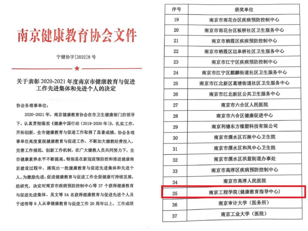 近日,南京健康教育协会印发《关于表彰2020-2021年度南京市健康教育与促进工作先进集体和先进个人的决定》,我校门诊部、健康教育指导中心被授予“南京市健康教育与促进工作先进集体”荣誉称号。