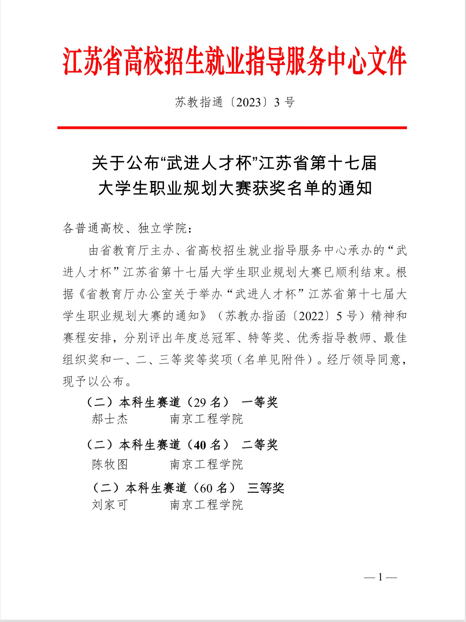 近日,“武进人才杯”江苏省第十七届大学生职业规划大赛总决赛获奖结果公布,我校推荐参加省赛的三名选手全部榜上有名,材料科学与凯发郝士杰,信息与通信凯发陈牧图、计算机凯发刘家可三位同学分别荣获本科生赛道一、二、三等奖。