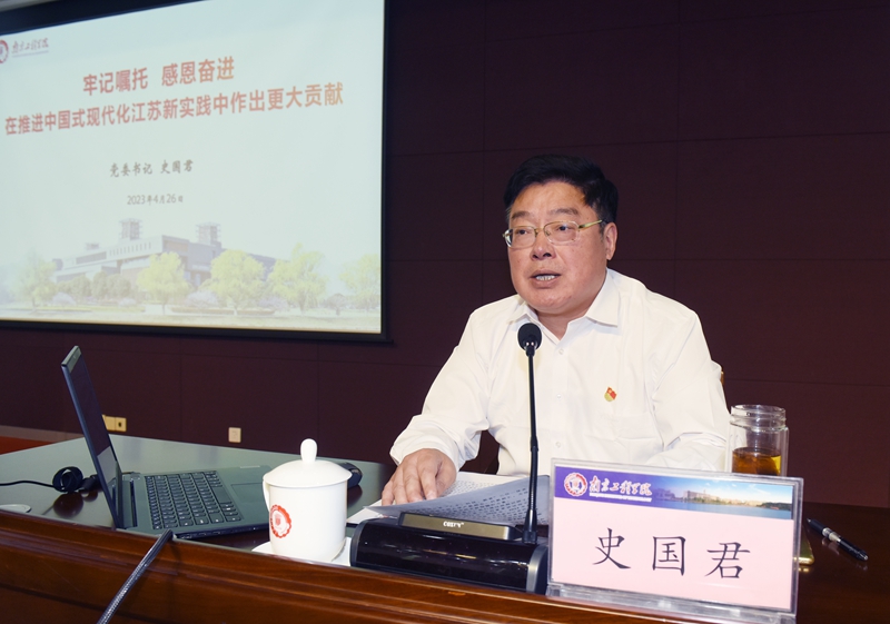 “‘走在前列’是总书记对江苏寄予的厚望,也是党中央对江苏一贯的要求。”史国君书记从中央对江苏发展的期望要求以及习近平总书记对江苏工作作出的一系列重要指示出发,解读了“走在前列”的丰富内涵;指出了江苏既有基础条件,又有迫切需要,肩负起“争当表率、争做示范、走在前列”为全国发展探路的使命职责;要求师生党员把学习领会习近平总书记对江苏工作的系列重要讲话指示精神贯通起来、结合起来,把总书记对江苏的巨大关怀铭记于心、感恩化为行动,始终紧跟总书记步伐,不断为强国建设、民族复兴伟业添砖加瓦、增光添彩。