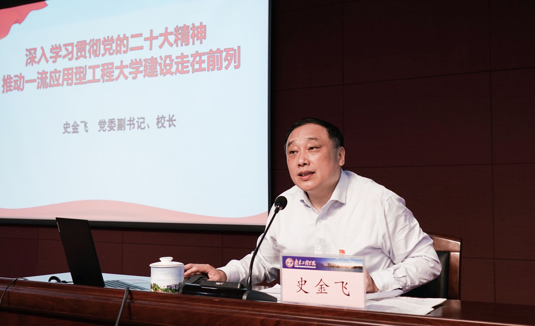 5月5日下午,校党委副书记、院长史金飞以“深入学习贯彻党的二十大精神 推动一流应用型工程大学建设走在前列”为题,在至勤楼·行政中心多功能厅为党员干部讲授学习贯彻习近平新时代中国特色社会主义思想主题教育专题党课。