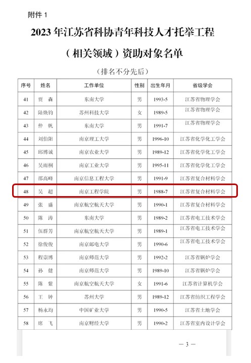 江苏省“青年科技人才托举工程”是由江苏省科学技术协会自2017年起立项的省级人才计划,重点支持35岁以下具有较好的理论基础、较强的创新能力、良好的科研潜质的青年科技人才,鼓励和帮助其做出更多更好的创新成果,成长为国家、江苏省主要科技领域高层次创新领军人才和科技创新团队后备力量。本年度江苏省“青年科技人才托举工程”总计入选58人。