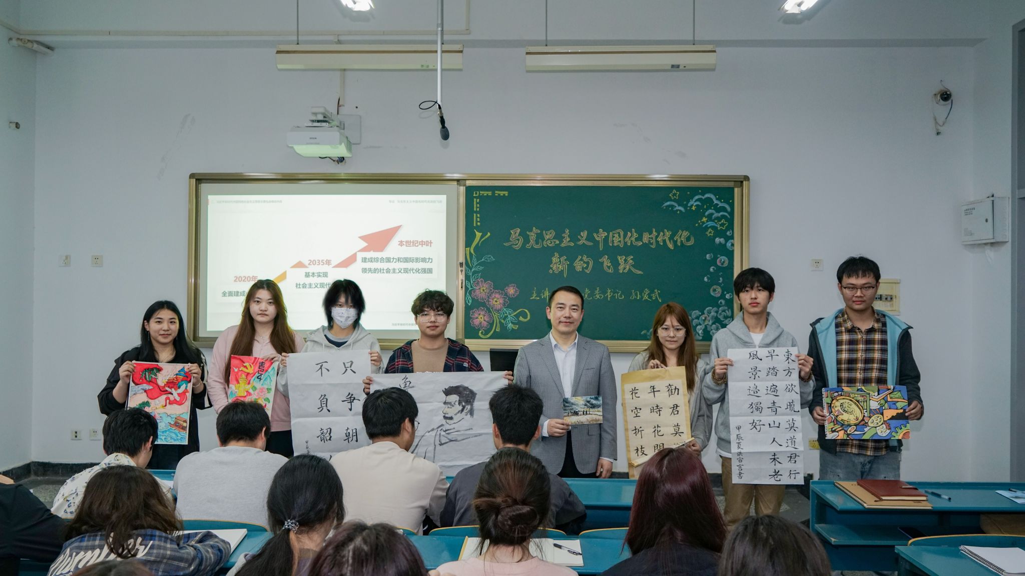 正值五四青年节前夕,班级同学还向孙爱武展示了各自创作的书画作品,以青春之名,表达爱党爱国之情、对未来美好生活的向往以及立志建设社会主义现代化强国的雄心。