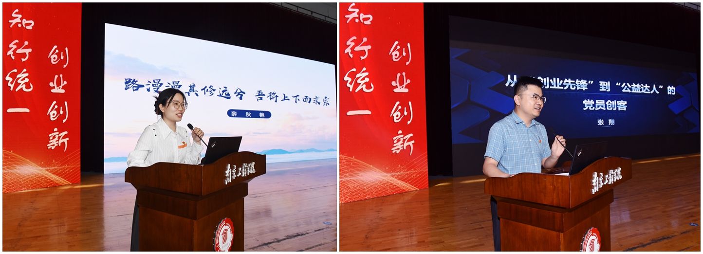 江苏省社会工作领军人才、江苏省“最美社工”、南京市优秀党务工作者、社工111班薛秋艳,南京友博网络科技有限公司总经理、江宁区政协委员、苏青合伙人党支部书记、网络071班张翔作为优秀校友党员代表发言。他们深情回忆了在校期间的求学时光,并结合各自创新创业经历,勉励学弟学妹恪守“学以致用”校训,在人生的每一个阶段脚踏实地、努力耕耘。