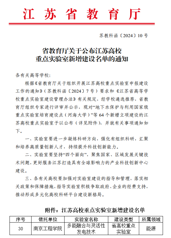 近日,江苏省教育厅发布《关于公布江苏高校重点实验室新增建设名单的通知》(苏教科函〔2024〕10号),我校“多能融合与灵活性发电技术重点实验室”名列其中,顺利获批。截至目前,我校共获批4个江苏高校重点实验室。