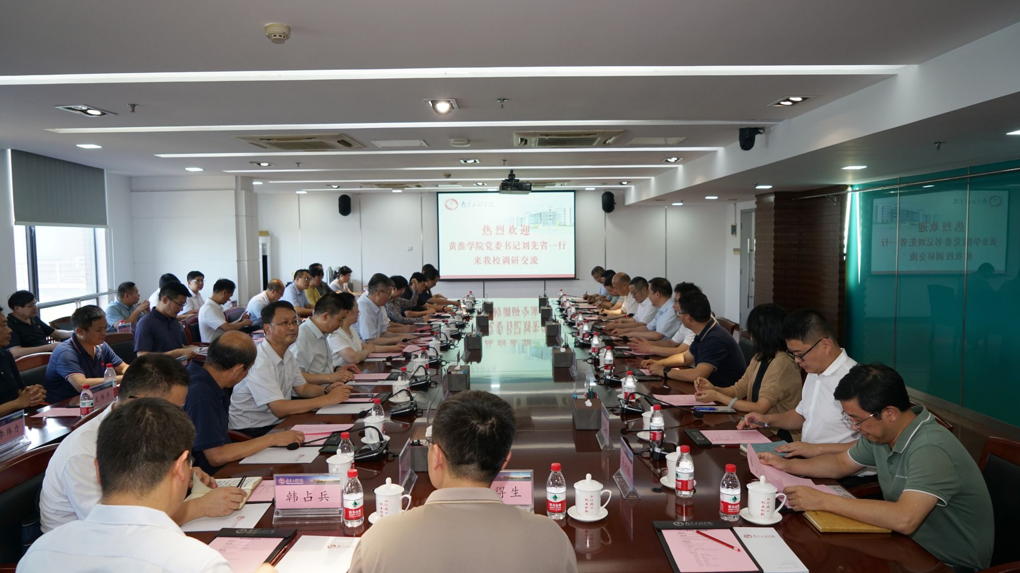 7月25日下午,黄淮学院党委书记刘先省,党委副书记、校长李晓彦等校领导和部分职能部门、二级学院负责人来访我校,就应用型本科教育和应用型人才培养的经验和做法进行专题调研。党委书记孙爱武,党委副书记、校长张仰飞在至勤楼·行政中心北楼303会议室热情接待了来宾并座谈。副校长包永强,相关职能部门和二级学院负责人参加活动。