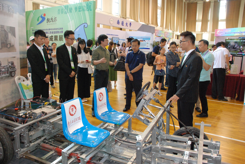 2017年江苏省大学生科技创新成果展是第十五届“挑战杯”全国竞赛江苏省选拔赛决赛系列活动之一。经各高校报送、团省委选拔,共汇聚了省内35家高校的43件科技创新作品。展出期间,团省委副书记司勇驻足我校展位,听取了《可伸缩纯电动汽车》的介绍,肯定了我校大学生创新工作成果。