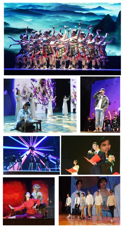 岁月峥嵘,万里山河朗;华夏疆土,花开百代荣。滔滔江河水,涤不尽浩浩中华魂;巍巍昆仑山,锁不住阵阵中华风。舞蹈《松花江上》再现了“九一八”那个让人沉痛的时期,悲戚的舞姿深深打动着在场观众的心;民乐合奏《森林狂想曲》将中国传统乐器与自然糅合,带领我们前往一个清凉又纯净的世界;教师舞蹈团带来的表演《茉莉花》,柔美的舞蹈与婉转悠扬的旋律相结合,诠释了别样的风采;朗诵《无悔情》,用激情澎湃的演说再现《亮剑》中李云龙与秀芹炮台对话的桥段,展现其凄美的革命爱情的同时也激起大家的爱国情怀;独唱《活着》提醒我们要珍惜、享受生活,感恩美好的当下;舞蹈《青春三部曲》,演员们用极富生命力的表演,让我们感到一股名为青春、名为创作的力量正冲击着未来;街舞《穿越时空》,以其独特的动作和创意、帅气的律动和张扬,将全场的气氛再次推向高潮。大合唱《国家》唱述心中浓厚的中国情,也为整场晚会画上完美的句号。