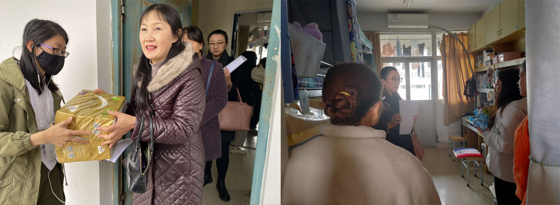 王书记一行先后走访了18个学生宿舍,老师们热情地与同学交谈。王书记询问了异地的同学们是否适应南京的气候,提醒同学们最近天气多变,昼夜温差大,记得防寒保暖,并为同学们送上了温馨实用的慰问品。社保191第二班主任张小慧老师呼吁同学们在认真展开期末复习工作的同时也要注意休息,劳逸结合才能最大化学习效率,才能以最好的状态迎接考试。社保201第二班主任袁宁宁关心道:“同学们遇到了问题一定要及时和老师或辅导员联系,力争尽早解决,以更好地状态投入到学习生活当中。”同学们纷纷表示谢谢老师的关心,一定不辜负老师们的殷切期望,奋发努力、立志成才。