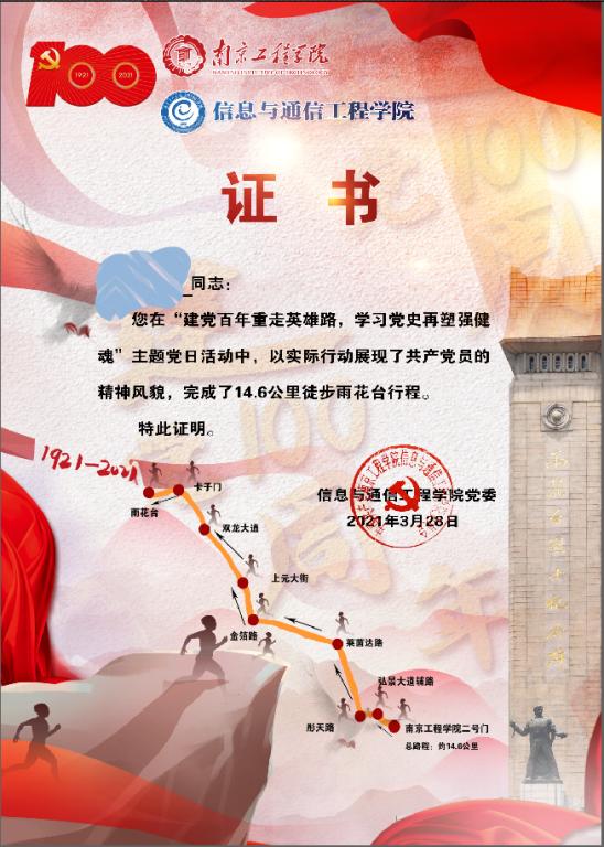 清晨,50名师生党员整齐地列队集结信通学院广场,在学院党委陈建红书记简短有力的动员后开始了这次活动。徒步行程途经江宁博物馆、河定桥广场、卡子门等地,到达雨花台烈士陵园,完成了一次历时3.5小时、总计14.6公里的“红色行走”。