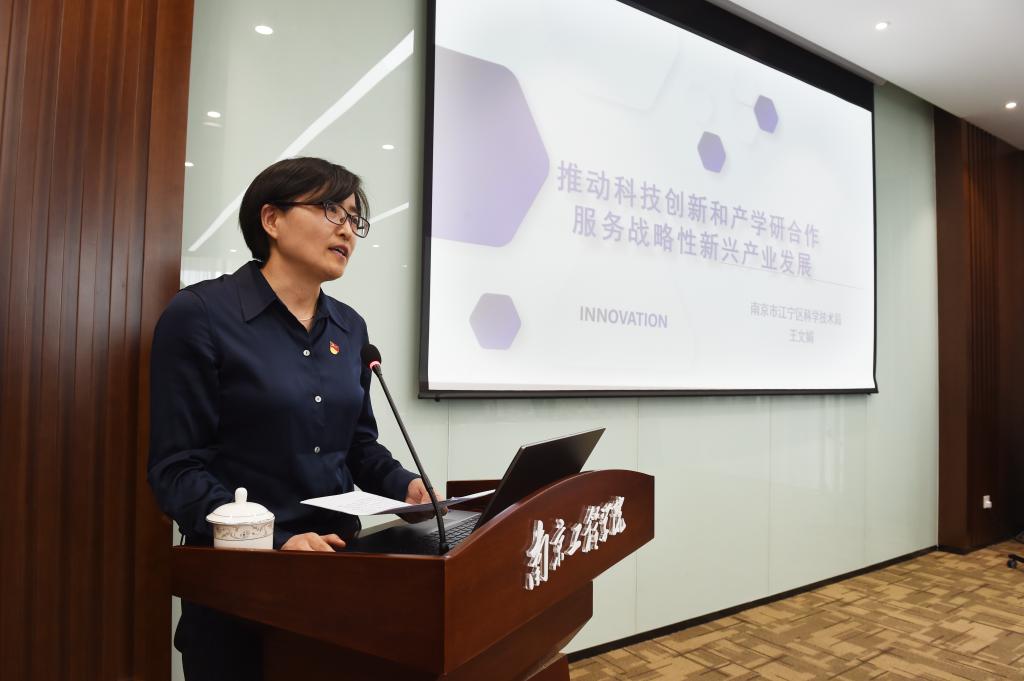 南京市江宁区科技局王文娟副局长作“推动科技创新和产学研合作,服务战略性新兴产业发展”主题报告,她带领各位党员学习习总书记在中国科学院第二十次院士大会、中国工程院第十五次院士大会和中国科学技术协会第十次全国代表大会上的重要讲话。介绍了江宁区在创新名城建设方面从单点突破走向融合发展、从技术创新走向制度创新、从科技创新走向全面创新取得的丰硕成果,并宣讲了江宁区鼓励科技创新和产学研合作的政策措施。