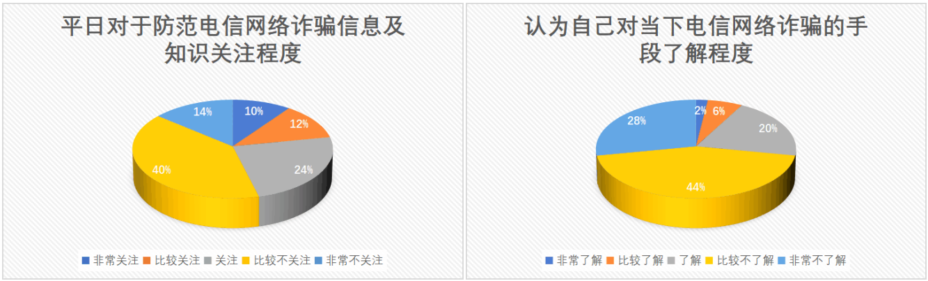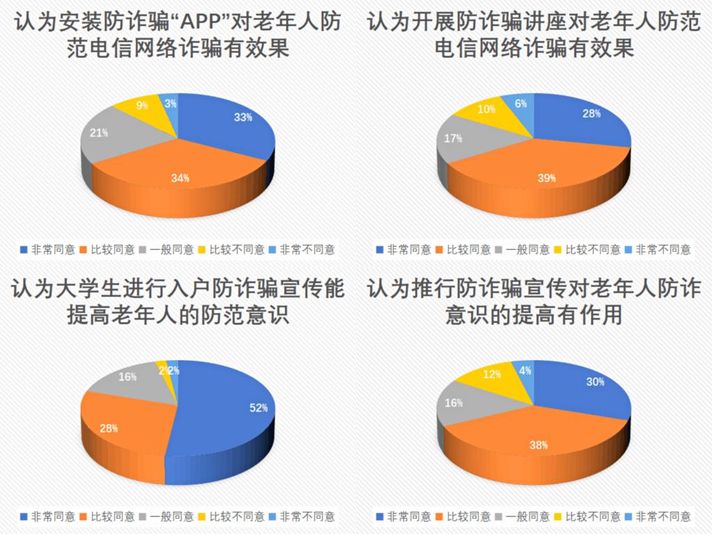 团队成员通过调查发现,超过70%的老年人表示接收到过诈骗电话或者诈骗信息。然而,老年人对于防范电信网络诈骗信息及知识关注程度却较低。四百多位受测者中,绝大部分老年人对当下电信网络诈骗的手段不大了解,仅仅有10%的老人表示非常关注防诈骗的相关信息,28%表示对电信诈骗非常不了解,而表示对防范电信诈骗非常了解的仅仅占到2%。在表示对当下电信网络诈骗手段有一定了解的老年人群中,其中88%表示“安装防诈骗APP”对防范诈骗有效,84%认为开展防诈骗讲座等防诈骗手段,超过96%的老年人认为深入群众生活,入户宣传这一方法对老年人防范电信网络诈骗非常有效。