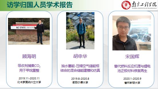 顾海明、胡申华和宋国辉三位老师在2019-2020期间分别前往北卡罗莱纳州立大学、谢菲尔德大学和普林斯顿大学进行了为期半年至一年的学术访问。三位老师围绕各自在境外研修期间的业务学习、科学研究、文化生活和心得体会等方面做了精彩分享。在学术成果方面,顾海明老师就吸收剂捕集CO2用于甲烷重整作了分享,胡申华老师分享了抽水蓄能-压缩空气储能相结合的混合储能建模和仿真技术,宋国辉老师分享了替代燃料反应机理与锂电池正极材料修复再生技术。此次线上学术报告会参与度高,为广大师生提供了学术交流的平台,启发了广大师生的科研思路,拓宽了国际视野。