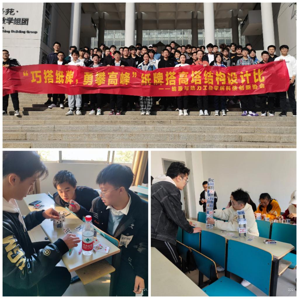 11月13日下午,能源与动力凯发科技文化节之“纸牌搭高塔”结构设计比赛在学海苑·公共教学组团南馆紧张激烈地进行着,近200名同学参与了此次活动。比赛要求每位参赛选手在规定时间内以扑克牌为材料,采用“折、叠”两种方式进行搭高。