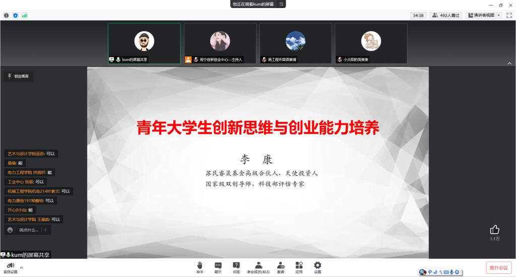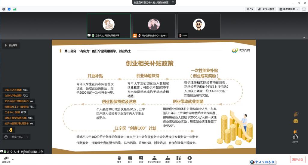 为加强疫情期间创业政策宣传,服务大学生创业需要,4月13日下午,由江宁区人力资源和社会保障局、江宁大学城创新与服务办公室指导,我校和南京青创宁盟企业管理有限公司共同主办的“宁聚计划”政策宣讲会暨大学生创业园“天印梦工场”创业沙龙以线上会议形式举行。江宁区领导、我校相关职能部门负责人、学工线创业工作负责教师及各二级学院(中心)有创业意愿的学生共460余人相聚云端,共话创业。