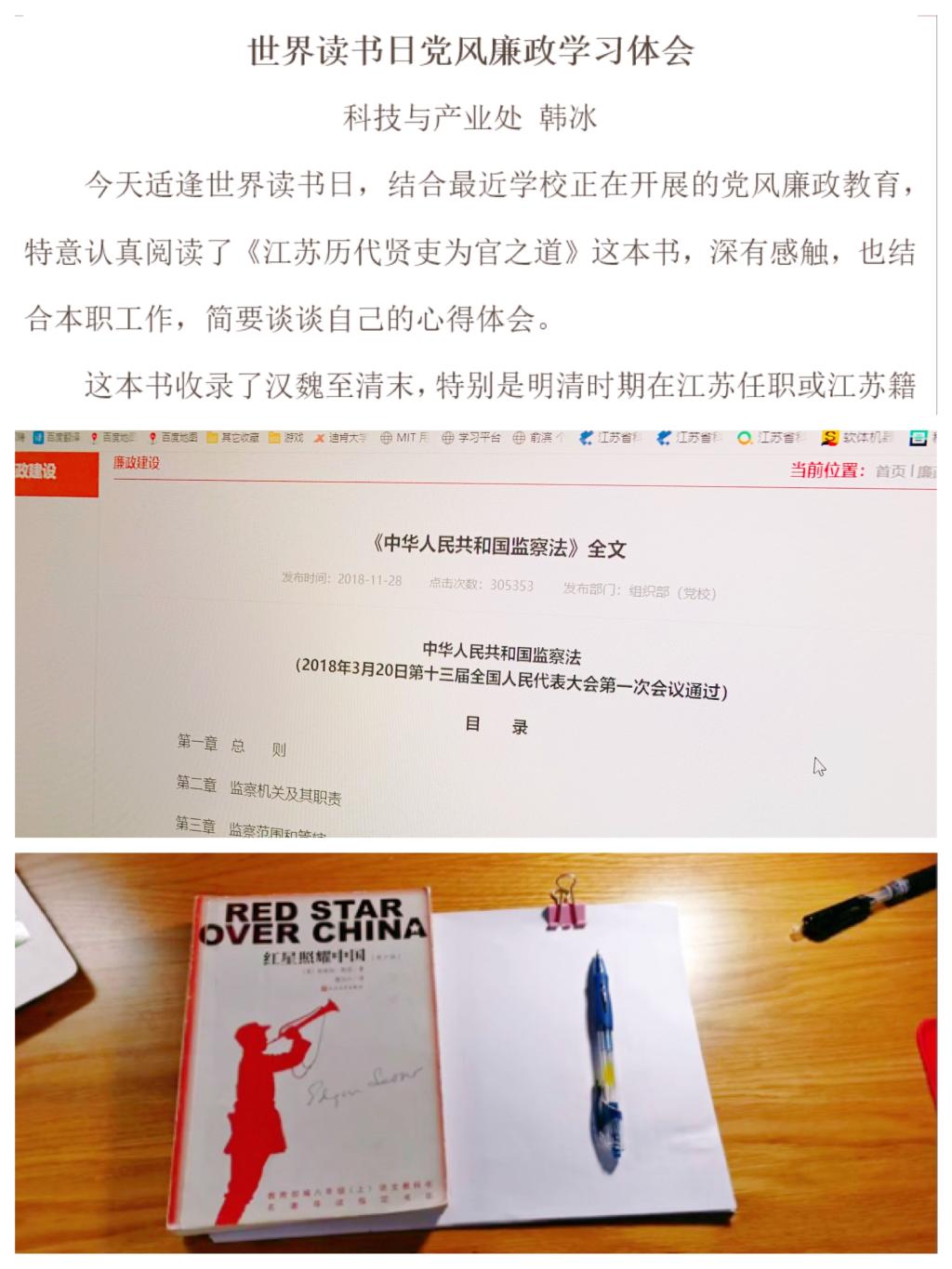 活动中,大家翻开了《中国共产党简史》《江苏历代贤吏为官之道》《红色家规》,学习了《中华人民共和国监察法》《中国共产党廉洁自律准则》,有的老师还推荐了《百年大党旗正红》《红星照耀中国》等书籍。“周恩来总理的‘十条家规’尤其让我印象深刻,我看到了先辈们的家国情怀,我辈青年当学习先辈之志,踏实工作,砥砺前行,不负盛世。”“腐败往往都是从小事开始的,千万不能‘勿以恶小而为之’。我们当以古今贤能为镜,时常提醒自己,坚守人生底线,恪守职业道德,做好本职工作,全心全意服务师生。”本次活动共收到30余篇读书心得体会和阅读照片,教师党员们用文字、PPT或书法的形式分享了自己的读书学习体会,每位参与者可获定制版书签1个,让书签伴随阅读,让书香浸润人生,让清廉深入人心。