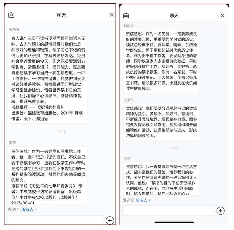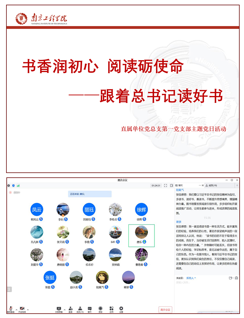“在晨光初露、湖水满盈校园里走一走,总能看到或坐或站、正专注诵读的身影,那样的画面才是最美的,它透着青春,洋溢着活力和希望;步入图书馆,见到同学们在宽大厚实的阅览桌前埋头阅读时、在高大的书架前驻足寻书时,感受到的是浓浓的书香氛围,我觉得这才是最为美丽动人的校园……”“腹有诗书气自华,爱读书的人自带光芒”“三日不读书便觉面目可憎语言无味。古人对读书的感情感受对我们也是一种很好的启迪和鞭策。”活动中,党员不仅结合校园、结合工作分享读书体会,还围绕《苦难辉煌》《钢铁是怎样炼成的》《为什么是中国》《火种》《青春之歌》等10余本自己喜爱的红色书籍荐书、讲书,线上会议气氛十分活跃。