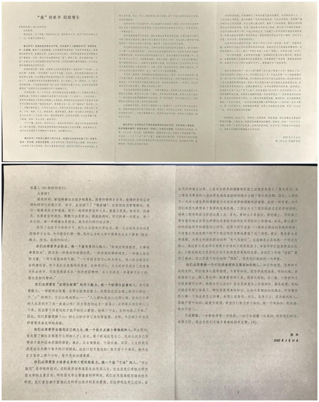 会后,各班第二班主任结合班级实际情况和班会中同学们提出的困惑,共写下58封家书,信中的问候、文字的鼓励都是病毒无法隔绝的情意。在机器人201的家书中,第二班主任朱晓春从讲解国家疫情防控形势与政策到解答同学们网课中的困惑,再到关心同学们疫情防控期间的身心状况,纸短情长,书下了万千牵挂。而在机器人191班的家书中,第二班主任、校人才工作办公室主任张泳则指出担当、毅力、规划、实践和知识是大学学习生活必不可少的五要素,勉励同学们不负韶华,珍惜大学时光。