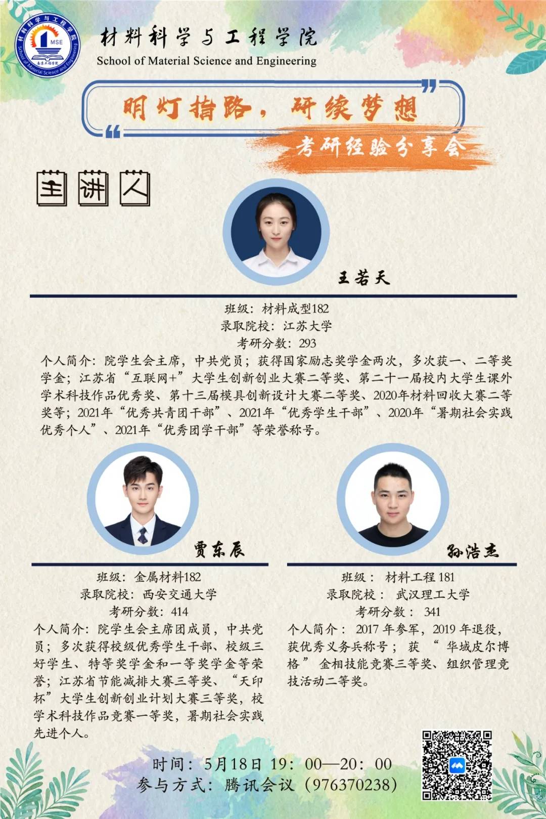 为帮助2019级学子解答考研困惑,掌握考研技巧,了解更多考研信息,近日材料科学与凯发通过腾讯会议平台举办了“研途畅享,助力绽放”考研学习经验分享会。
