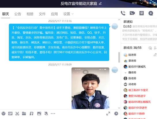 “同学,你遇到的情形听起来可能是刷单骗局,我的建议是不要盲目相信,拨打96110(反电信网络诈骗专用号码)进行举报,配合警方处理此事。”核工程191班反电诈联络员崔宗杰正在耐心解答一位同学的疑惑。该院组建反电诈宣传队伍,开设反电诈联络员工作群,各班级均配备反电诈联络员,联络员们每天将最新的警方提示、反诈技巧等内容向班级同学宣传,并为同学们答疑解惑。此外,该院还在工程实践中心9号楼一楼设立反诈长廊,通过展示反诈海报、发放宣传页、宿舍张贴宣传标语等方式,将“全民反诈、从我做起”的观念根植于心。