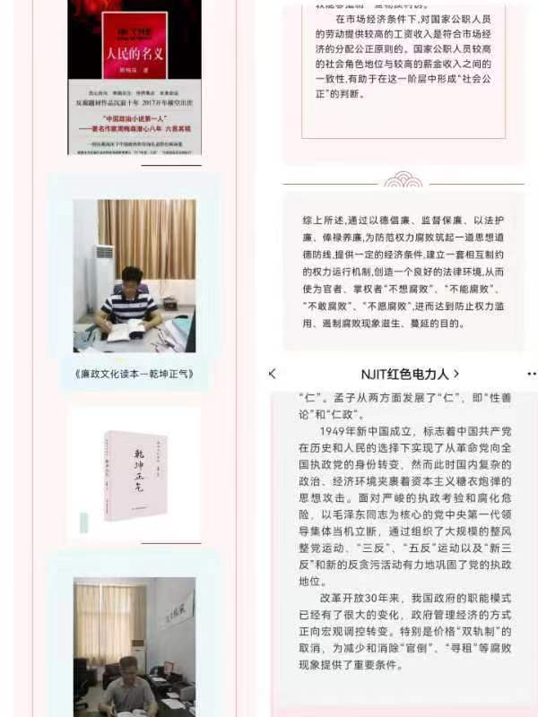 活动依托学院党建公众号“红色电力人”进行,分为五个板块,分别是“廉政从教”的介绍与探源、腐败的现象成因、廉政的措施、讲清廉故事、廉政书目读后说。旨在将廉政文化建设与校园文化、师德教育相结合,通过公众号分享廉政从教名言警句,通过书法、绘画等不同形式展示,使廉政文化入脑入心,时刻鞭策自己,向善向美,营造崇廉尚廉的良好教育氛围。
