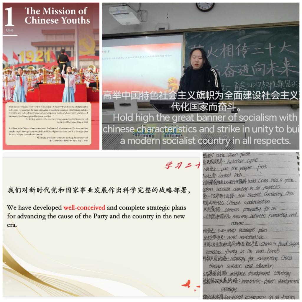 双语热词,深悟会议精神。学院立足于英语专业特色,开展了党的二十大报告“双语金句”学习、“热词翻译”活动,让报告的热点词汇走进课本、深入课堂、融入头脑,加强学生的理想信念教育,在学习金句热词的同时提升专业技能,从专业角度深悟会议精神。在此期间,学院面相全校学生开展了以“中国智慧”为主题的英文演讲比赛。各团支部积极创新活动形式,开展了双语热词分享、分组录制双语Vlog、党的二十大报告翻译笔记大比拼等活动。
