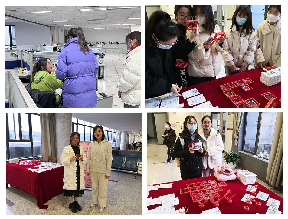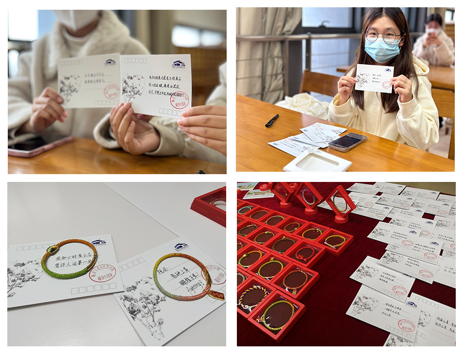 中国绳结艺术历史悠久、形式多样,包含着美好的寓意,被列入非物质文化遗产名录。早在一个月前,活动组织方就开始着手准备,决定编织绳结为即将考研的同学们送上祝福。大家通过现场集中学习,初步了解了绳结的制作方法,并反复观看教学视频,逐渐掌握编织的技巧。从开始一次次的返工到熟能生巧,往往耗费了数天的课余和业余时间,每一只作品的完成,都凝结了每位制作者的细心、耐心和爱心。信管学生党支部的毕翔宇同学表示:“没想到绳结编织会这么复杂,太有挑战了!编成之后也更有成功的喜悦。这也是学长学姐们的考研精神激励着我不怕困难,坚持就是胜利!”。“这些亲手完成的作品具有不同寻常的意义,在‘非遗’与‘传承’的交融中,每一个绳结都是爱与祝福的象征,希望能给考研的同学们带来好运。”图书馆党支部的杨凤云老师说道。
