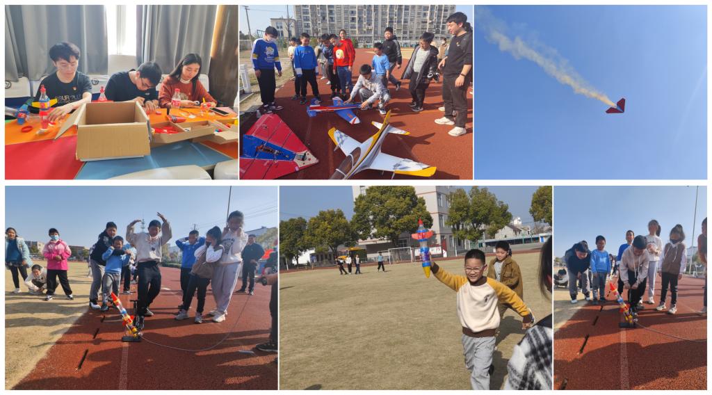 课堂教学后,师生们来到操场,为孩子们进行了精彩的航模表演,引来阵阵喝彩。学生党员们还现场教学,带领大家进行了“水火箭”的制作和发射。了解了其中的物理原理后,在大哥哥大姐姐的指导下,小同学们手中的一个个可乐瓶成功变身为喷水火箭,划过操场上空。“我一定要好好学习科技知识,长大以后造出更加厉害的真火箭”,在场的小同学们纷纷发出这样的感慨。
