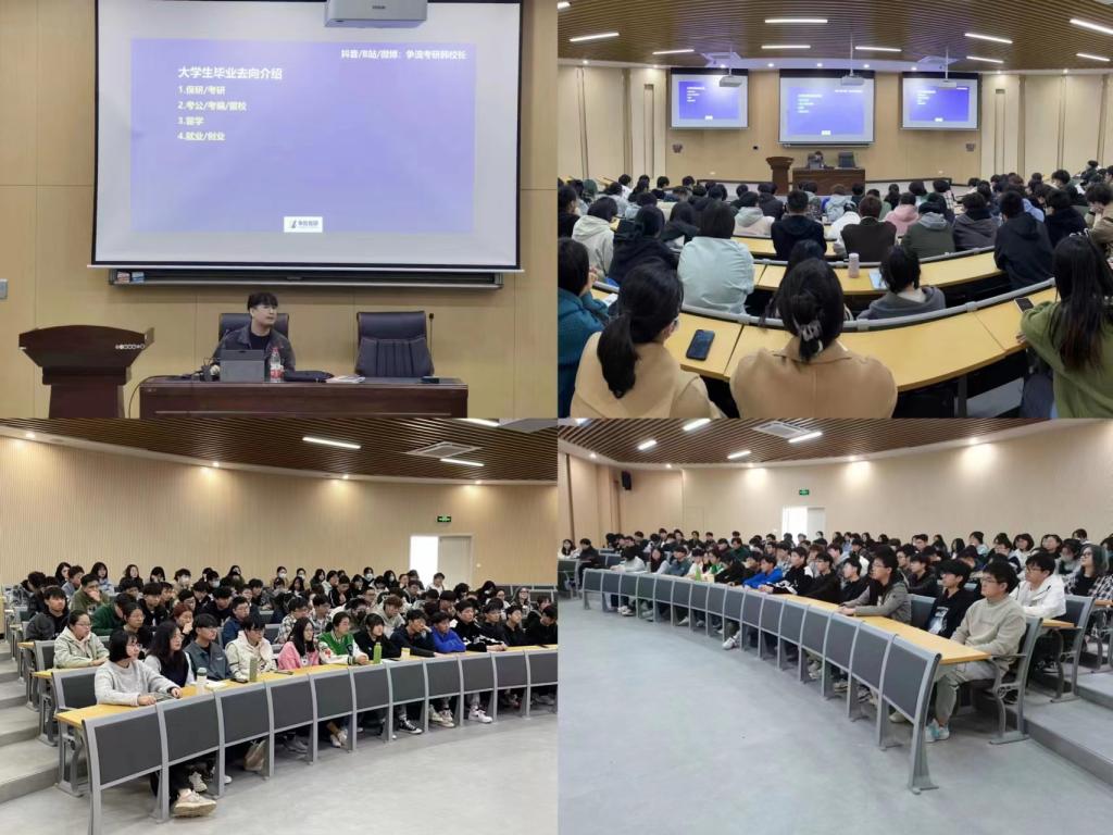 韩忻俊老师对考研、留学、创业、企业工作、考公考编等多种就业去向的优势劣势、晋升发展、薪酬福利、职业稳定性等进行了比较分析,围绕当前大学生的就业形势和计算机专业发展前景,启发学生尽早思考和规划未来的生涯选择。通过举例和分析,他重点详细介绍了当前考研形势、专业院校选择、考研规划、科学备考等方面内容,鼓励有意向考研的同学及早确定大目标,分阶段制订学习计划,以坚韧的意志力跑好考研进阶马拉松。讲座结束后,数字媒体212班缪佳纯同学说道:“听了本次讲座,让我更加意识到生涯规划的重要性,在接下来的学习生活中我会明确目标,好好规划自己的学习生涯、考研之路,脚踏实地,不断提高自己的专业知识水平能力,把握未来方向,努力奋斗。”