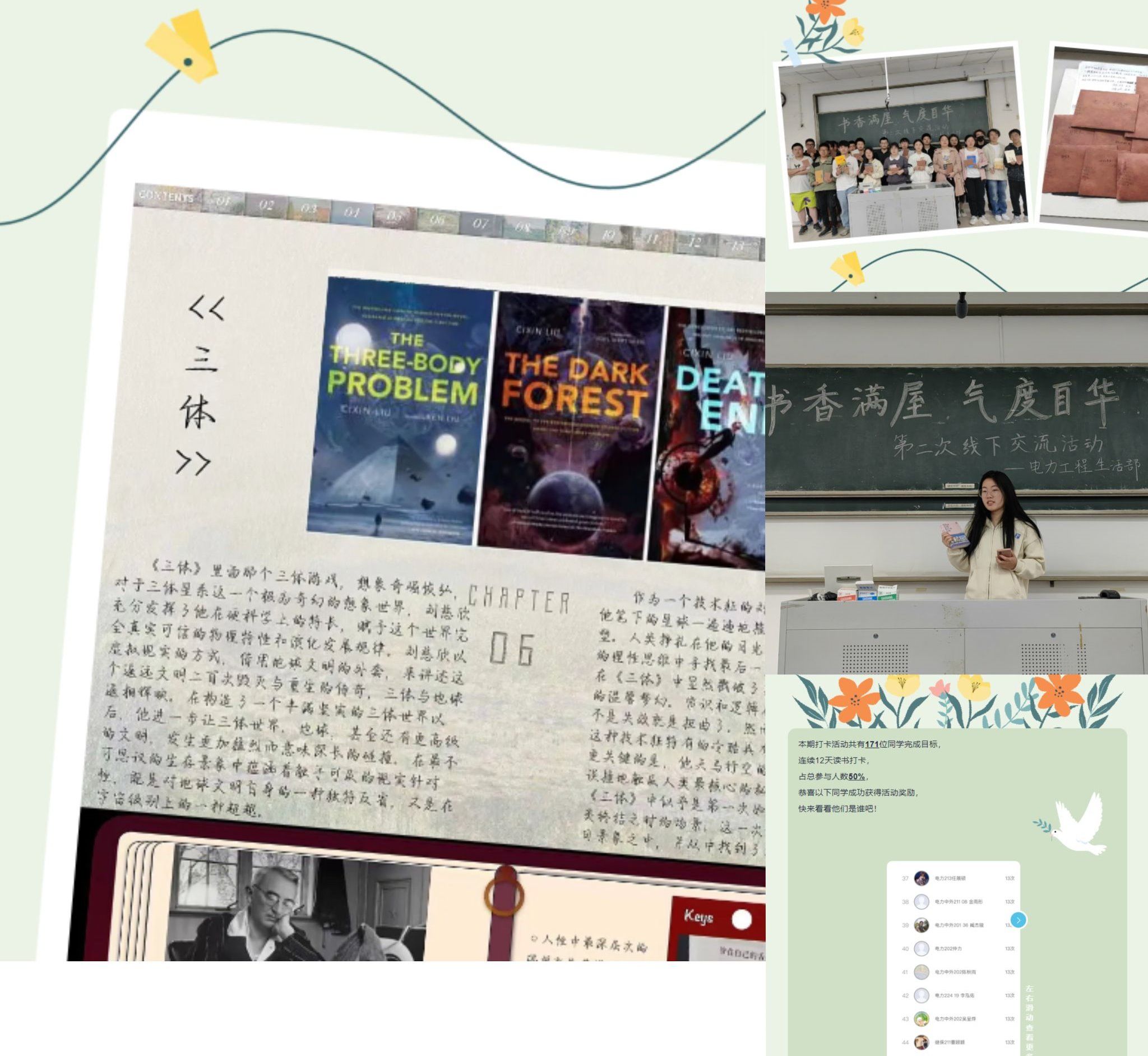 “春风送暖,阅享书香”阅读打卡。学院于3月中旬开展了为期12天的读书节系列活动,该活动借助微信小程序“鹅打卡”平台,让每位参与同学上传阅读图片,分享内容包罗万象,既有“一个人并不是生来要被打败,你尽可以把他消灭掉,可就是打不败他。”来自《老人与海》等书籍的笔记摘抄,也有“在历史传记的跌宕起伏里,感受人类与文明的碰撞;在诗歌与文学的悲欢离合中,体味百态人生的是与非。”这样的阅读感悟。截至目前,该院共有264位同学参加此次读书打卡活动,累计打卡1200余次。“阅读能给我前所未有愉悦和满足感,在那些失意迷茫的日子里,它都像一束光一样照进我灰暗无光的生活。”电力(中外)221班郁可怡在参加完本次阅读打卡活动之后这样说道。